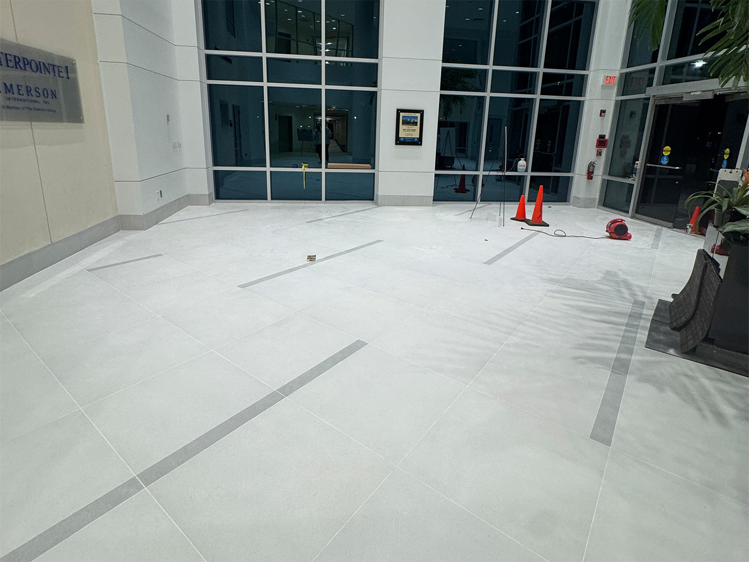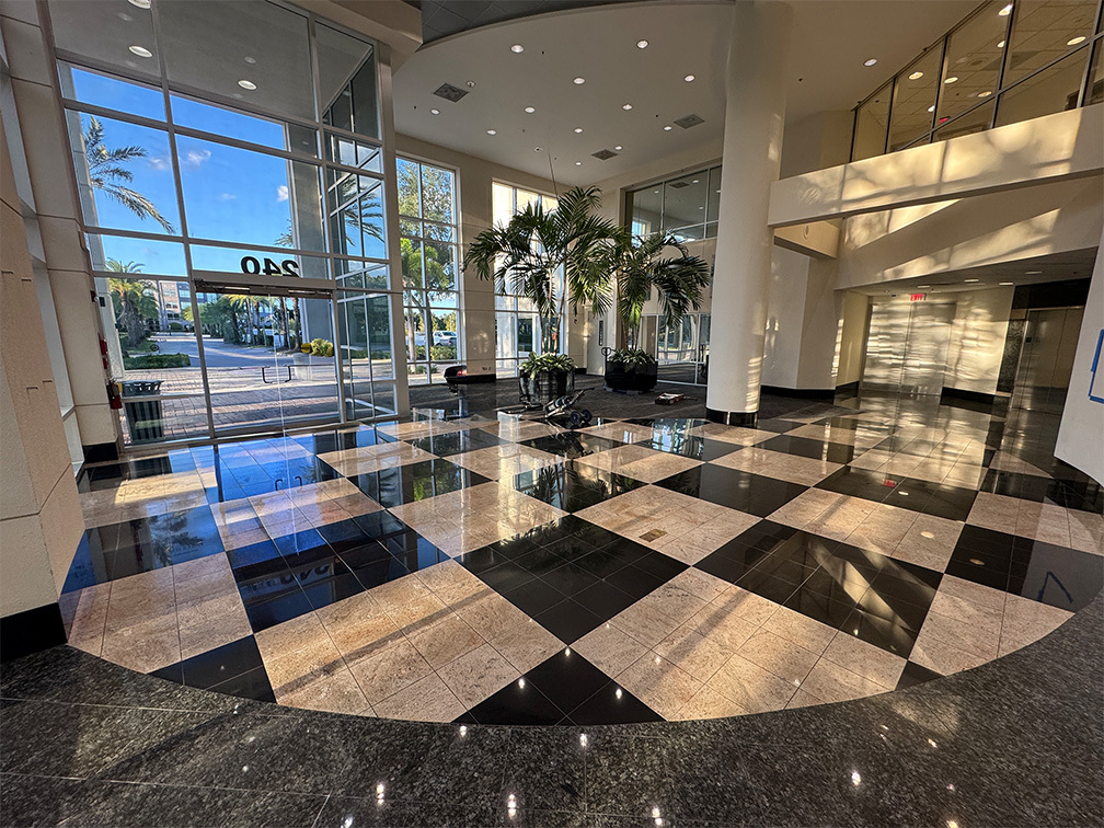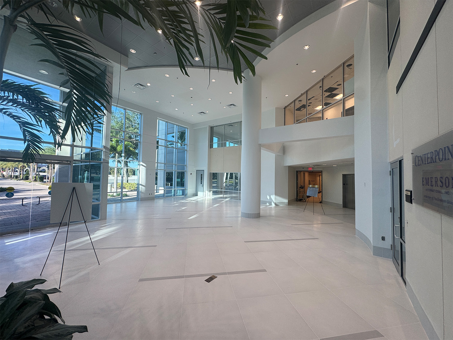The Centerpoint lobby renovation centers on enhancing the grandeur of its multi-story volume through sophisticated material continuity. We utilized large-format, polished stone flooring with integrated linear accents to guide traffic flow and emphasize the expansive footprint of the atrium. The design leverages massive floor-to-ceiling glazing to flood the space with natural light, highlighting the crisp architectural lines and contrasting ceiling elements. By balancing open, airy circulation with high-performance finishes, we created a professional environment that feels both welcoming and authoritative.