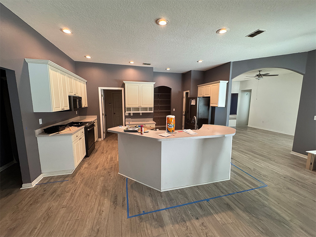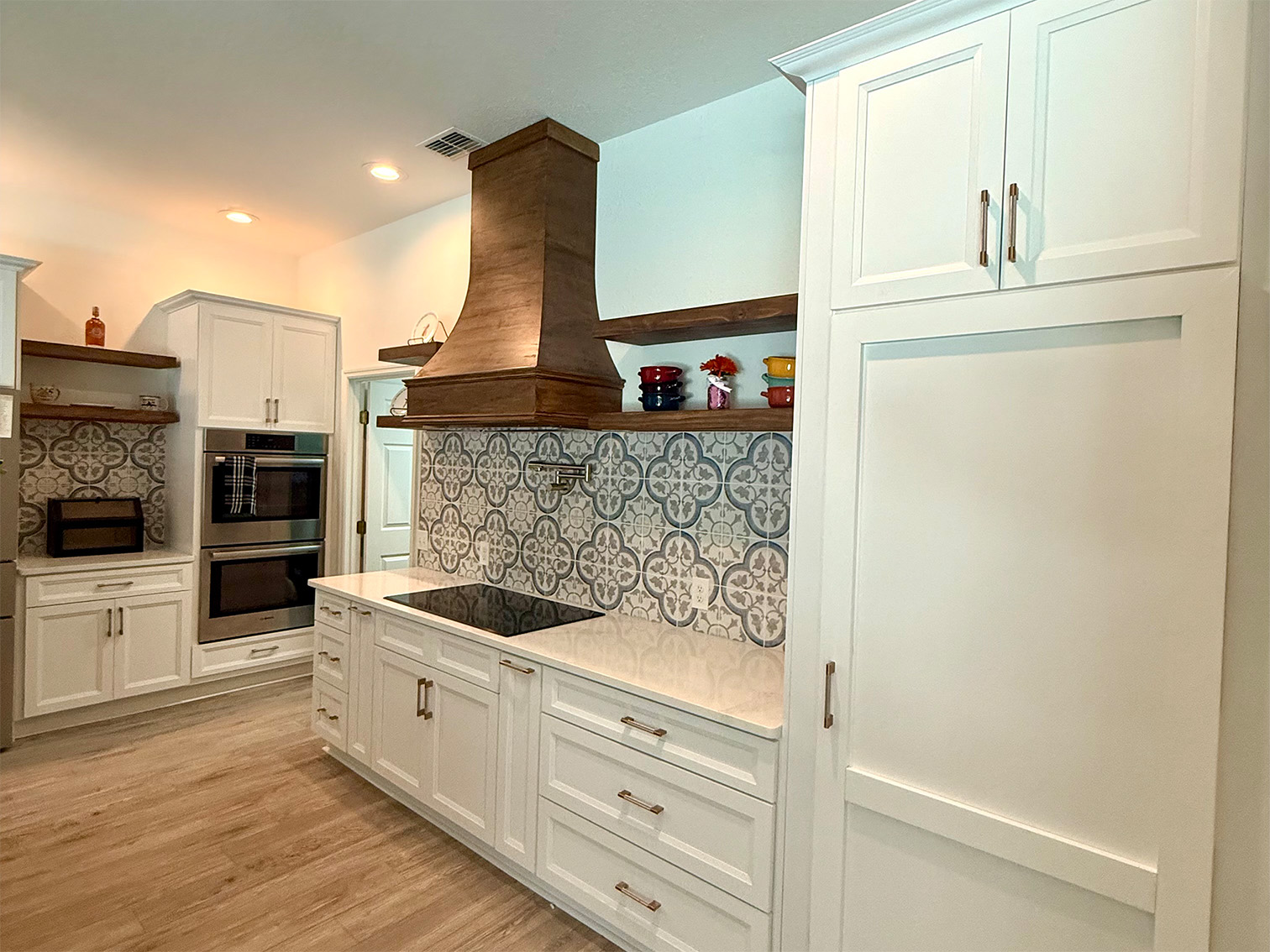 This comprehensive kitchen renovation masterfully balances bright, airy aesthetics with deep, natural wood tones. By utilizing a transitional design language, we created a space that feels both timeless and distinctly modern. Featuring custom-built white shaker cabinetry paired with a massive calacatta-style quartz island, the layout prioritizes flow and surface area. The design's focal point is the custom walnut-stained range hood and matching floating shelves, which offer a warm counterpoint to the stainless steel Bosch appliances. The patterned cement-style backsplash adds a layer of artisanal charm, while the integrated coffee nook and built-in wall ovens maximize storage efficiency without sacrificing style.